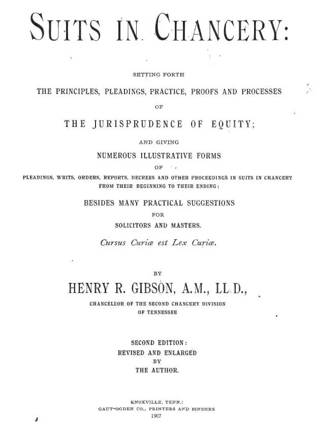 Henry R. Gibson Treatise on on Suits in Chancery provides practical case examples, Jurisprudence, and chancery court workings, Notices, Parties to Suits, Original bills, Appearances, and Pleadings.